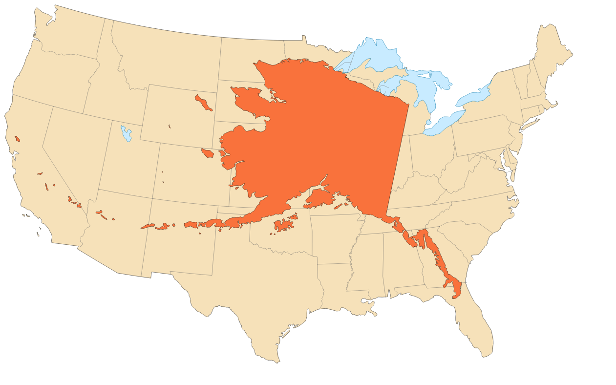 Showing the full united states with inset maps.